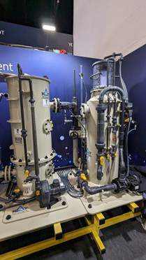 プロテインスキマーは、フィルターでは取り切れない細かな汚れを泡の力を用いて除去する装置ですね。 展示会場では人の背丈を余裕で超える高さのものばかりでしたが、これでも各社最小機種だそうです。1時間に何十トンという水を処理しなければなりませんので、納得ですね。 排出した泡の自動洗浄機能が標準装備でした。センサーでの機械制御等も見られましたが、構造はシンプルなものが一番ですね。