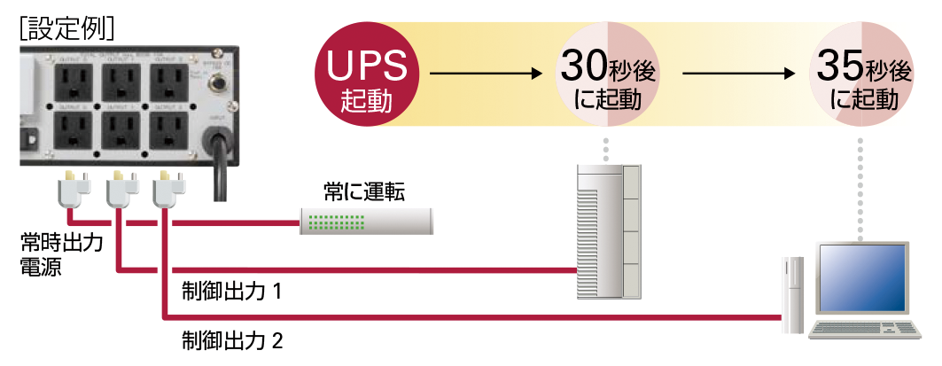 ハードディスクやサーバへの電源投入と停止操作のタイミングを容易に設定できます。(1 kVA・1.5 kVA のみ)